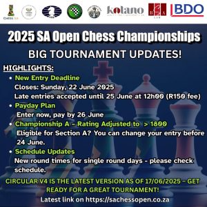 • Rating: This section will be FIDE & Chess SA Rated